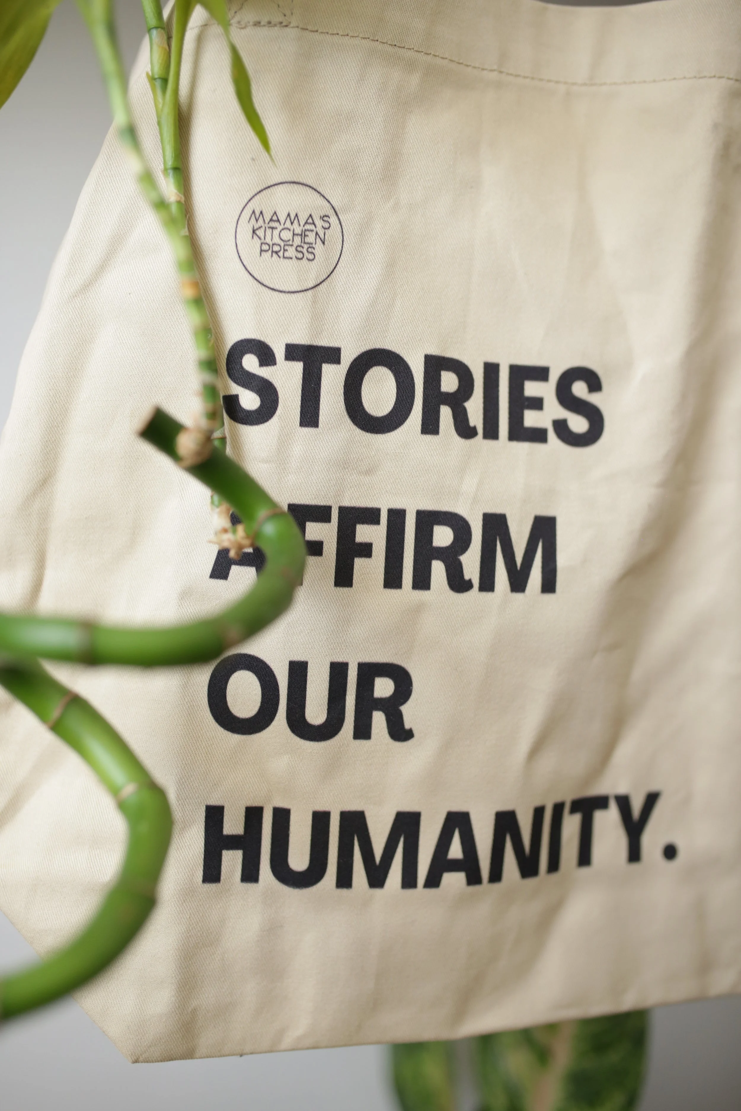 Cloth totebag with MKP slogan “Stories Affirm Our Humanity.”